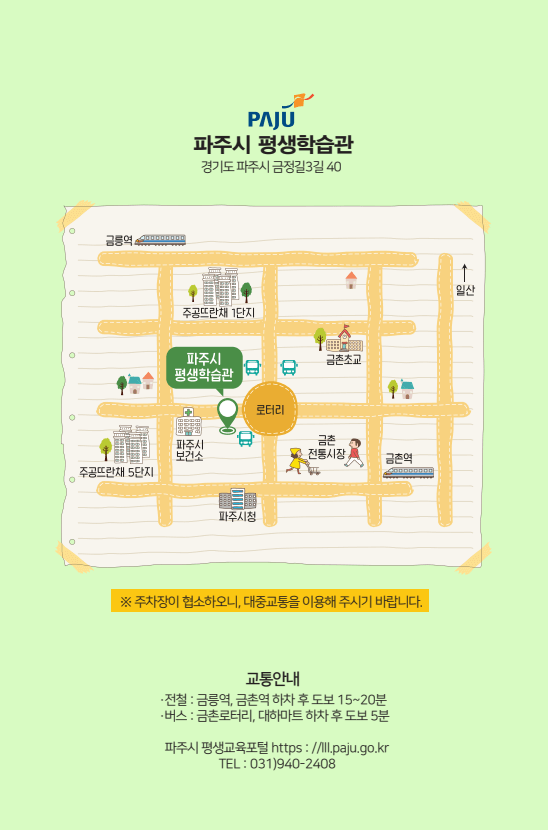 궁금하신 사항은 파주시 평생학습관(☎031-940-2408)으로 문의해 주시기 바랍니다.