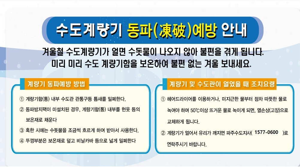 = 계량기부터 집안 수도관 동파는 거주자가 비용을 부담하여 수리하셔야 합니다.