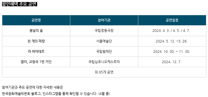 참여기관과 주요 공연에 대한 자세한 내용은 한국문화예술위원회 블로그, 인스타그램을 통해 확인할 수 있습니다.