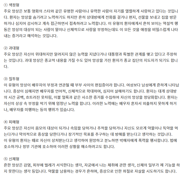 [1] 서울아산병원 - 망상 장애 | 질환백과 | 의료정보 | 건강정보 (https://www.amc.seoul.kr/asan/healthinfo/disease/diseaseDetail.do?contentId=31898)
